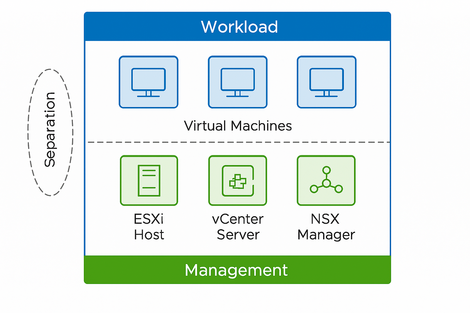 VMware’s own validated designs—including VMware Cloud Foundation—mandate separation of management and workload domains.