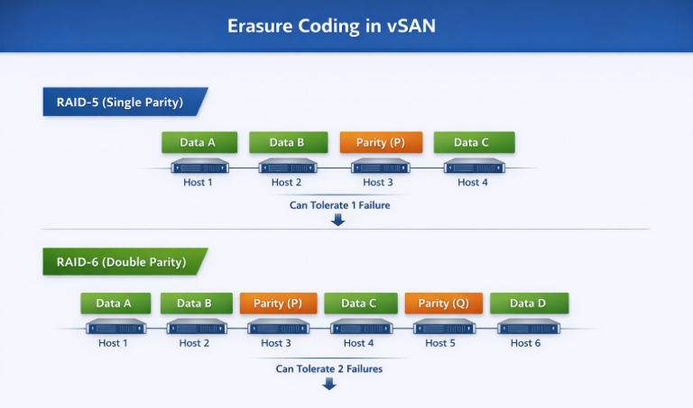 - Mechanism: Instead of mirroring, vSAN uses RAID 5 or 6 (Erasure Coding) to break data into fragments, calculates parity data, and distributes them across sites to tolerate a full site failure.